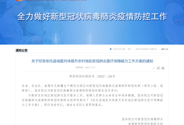 為做好農(nóng)村地區(qū)新冠肺炎醫(yī)療服務工作,保障高齡合并基礎疾病等重癥風險較高的感染者及時救治,在農(nóng)村地區(qū),以縣域醫(yī)共體為載體,提升縣級醫(yī)院重癥救治能力,發(fā)揮鄉(xiāng)鎮(zhèn)衛(wèi)生院和村衛(wèi)生室健康監(jiān)測作用,最大可能降低重癥率、病亡率,國務院聯(lián)防聯(lián)控機制11日發(fā)布《關于印發(fā)依托縣域醫(yī)共體提升農(nóng)村地區(qū)新冠肺炎醫(yī)療保障能力工作方案的通知》(下稱“方案”)。