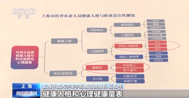 上海開放大學(xué)非學(xué)歷教育部部長(zhǎng) 王松華:我們用專門研發(fā)的健康人格和心理健康量表,從兩個(gè)維度八個(gè)方面,用92道題目對(duì)他們進(jìn)行測(cè)量。根據(jù)測(cè)量結(jié)果,對(duì)輕度不適宜的,我們將組織心理輔導(dǎo)專家對(duì)他們進(jìn)行輔導(dǎo),對(duì)重度不適宜的人群,我們將提出勸退建議,不建議他們從事這個(gè)崗位。