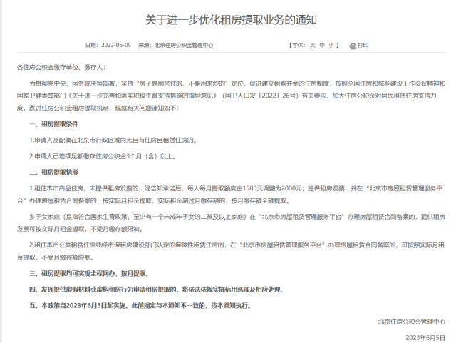 央視網(wǎng)消息:北京住房公積金管理中心發(fā)布《關(guān)于進一步優(yōu)化租房提取業(yè)務(wù)的通知》,通知明確,提高無發(fā)票租房的提取額度,新申請無發(fā)票租房提取的提取額度從每月1500元提高至每月2000元;加大對多子女家庭租房的政策支持,多子女家庭可以按照實際月租金提取住房公積金;積極推動房屋租賃合同備案,申請?zhí)崛∏皯?yīng)辦理房屋租賃合同備案;提高租房提取的支付頻率,所有的租房提取的約定提取周期將統(tǒng)一成按月提取。