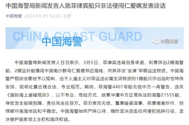 中國海警局新聞發(fā)言人就菲律賓船只非法侵闖仁愛礁發(fā)表談話