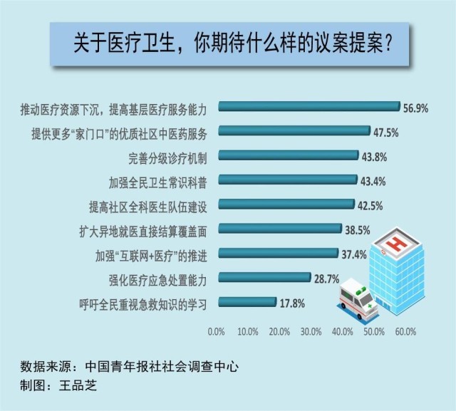 每年全國(guó)兩會(huì),醫(yī)療衛(wèi)生都是代表委員們熱議的話題。在全國(guó)兩會(huì)召開(kāi)前夕,中國(guó)青年報(bào)社社會(huì)調(diào)查中心聯(lián)合問(wèn)卷網(wǎng)(wenjuan.com),進(jìn)行了全國(guó)兩會(huì)青年期待調(diào)查,共有2002人參與。調(diào)查顯示,在兩會(huì)關(guān)于醫(yī)療衛(wèi)生領(lǐng)域的議題中,56.9%的受訪者最期待推動(dòng)醫(yī)療資源下沉,提高基層醫(yī)療服務(wù)能力,47.5%的受訪者期待提供更多“家門(mén)口”的優(yōu)質(zhì)社區(qū)中醫(yī)藥服務(wù)。