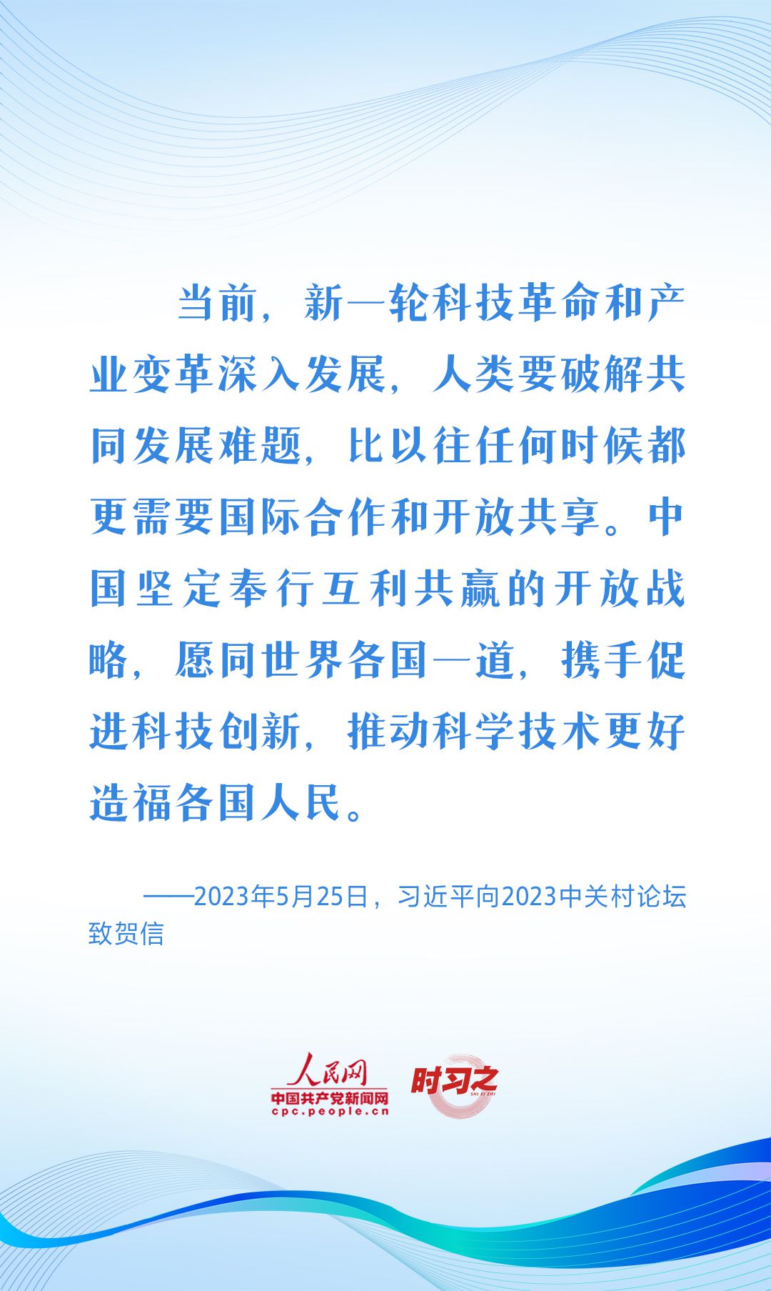 2023年5月25日,國家主席習(xí)近平向2023中關(guān)村論壇致賀信。習(xí)近平在賀信中指出,當(dāng)前,新一輪科技革命和產(chǎn)業(yè)變革深入發(fā)展,人類要破解共同發(fā)展難題,比以往任何時候都更需要國際合作和開放共享。