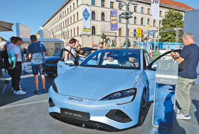 位于慕尼黑市中心的城市公共展示區(qū),不少觀眾參觀體驗(yàn)比亞迪電動汽車。