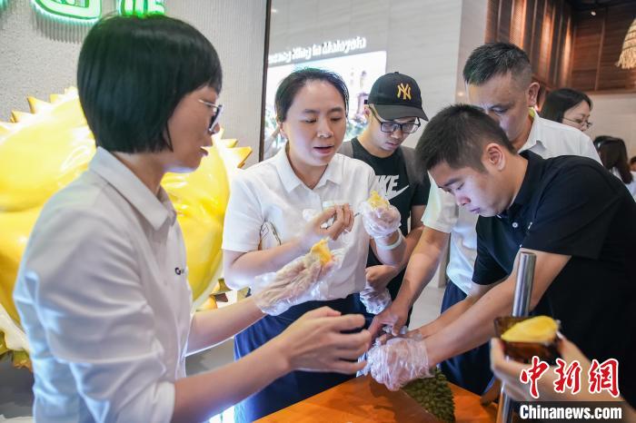 9月14日,廣西南寧消費(fèi)者搶“鮮”品嘗產(chǎn)自馬來西亞“貓山王之鄉(xiāng)”——彭亨州勞勿縣的榴蓮?!≈行律缬浾?陳冠言 攝