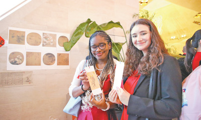 圖為在文化體驗(yàn)展臺,兩名美國學(xué)生展示自己用毛筆繪制的書簽。