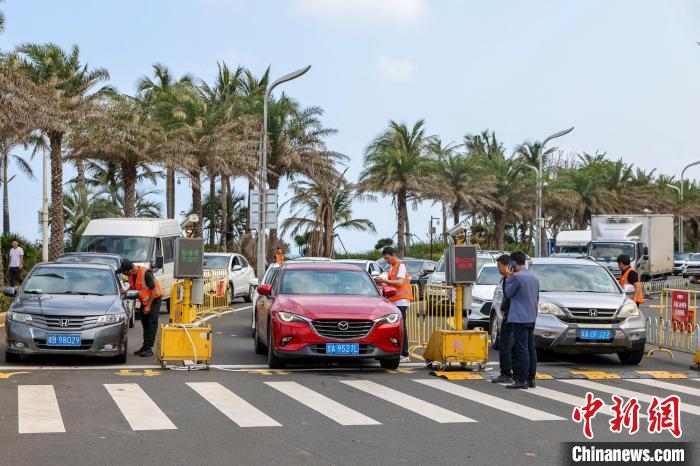 2月5日海口長(zhǎng)樂(lè)路,工作人員在查驗(yàn)過(guò)海車輛的訂票信息。中新網(wǎng)記者駱云飛攝