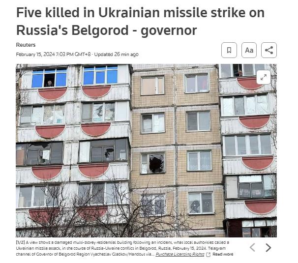 中新網(wǎng)2月15日電 據(jù)路透社報(bào)道,俄羅斯官員稱,當(dāng)?shù)貢r(shí)間15日,烏克蘭導(dǎo)彈襲擊俄羅斯別爾哥羅德州,造成5人死亡,其中包括一名兒童。