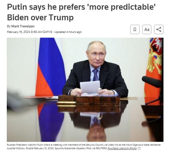 據(jù)報道,這是普京首次公開評論2024年美國大選。當被問及兩人誰當選對俄羅斯“更有利”時,普京回應:“拜登,他更有經(jīng)驗、更有預見性,是一位老派政治家?!?/p>