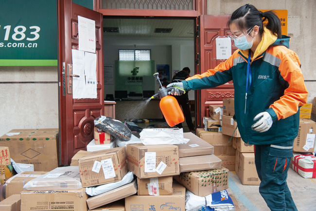 3月20日,在金華一快遞公司人民東路特快專遞攬投部,員工給快件和派送車輛噴灑藥水進行消殺。據(jù)了解,為做好新冠疫情防控工作,運載快件的大型車輛到達后,卸貨前先要對車輛消殺,再給快件消殺;快遞員每次出車派送返回攬投部,都要按要求給車輛消殺。工作場地每天早、中、晚消殺3次,記錄在工作臺賬上。(時寬兵)
