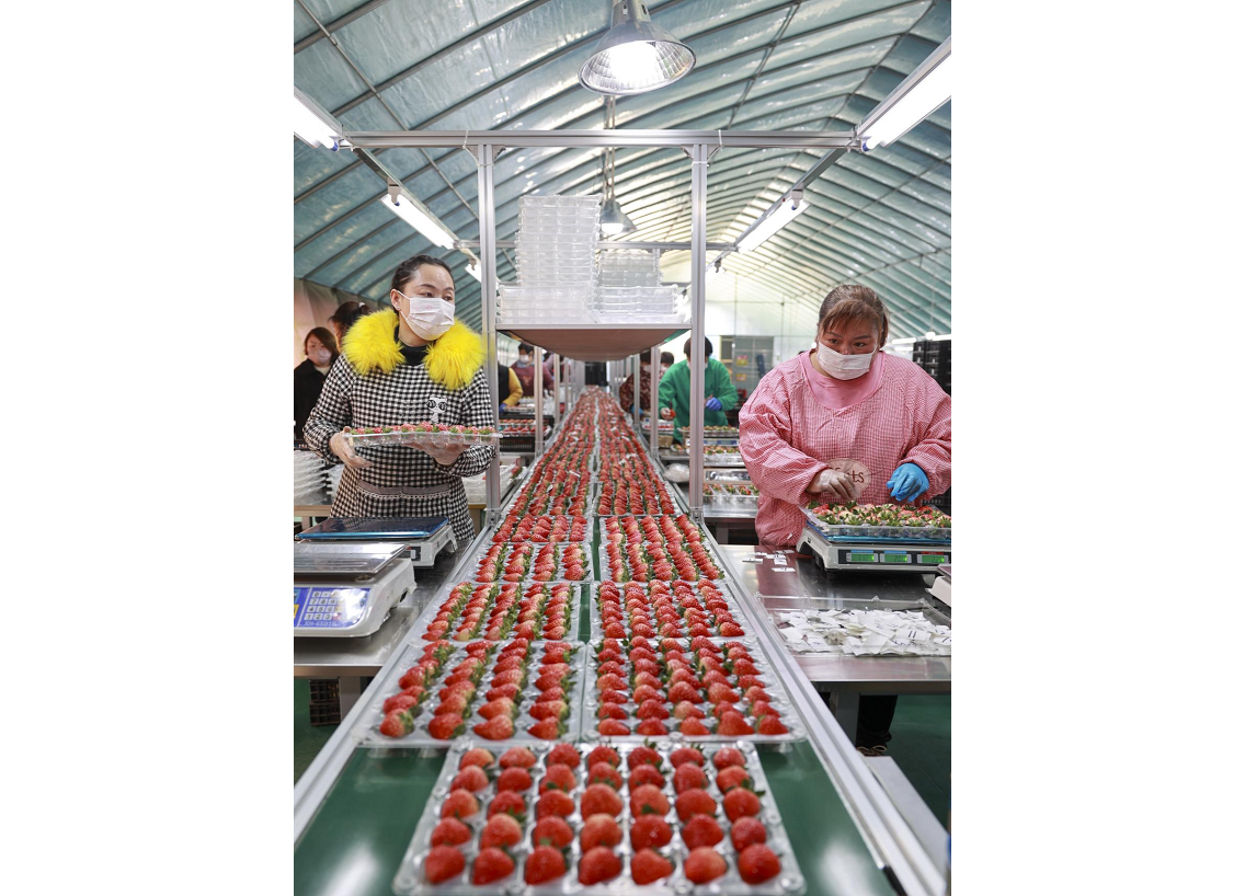 工人們?cè)诹魉€上分揀草莓(央廣網(wǎng)發(fā) 顧繼紅 攝)