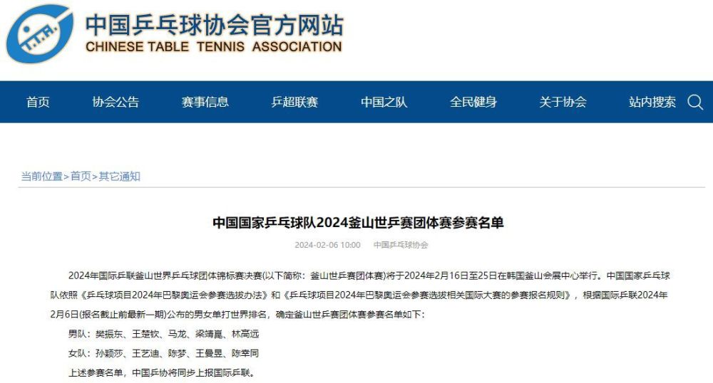 北京時間2月6日,中國乒協(xié)官網(wǎng)發(fā)布了中國國家乒乓球隊釜山世乒賽團體賽參賽名單。中國國家乒乓球隊依照《乒乓球項目2024年巴黎奧運會參賽選拔辦法》和《乒乓球項目2024年巴黎奧運會參賽選拔相關(guān)國際大賽的參賽報名規(guī)則》,根據(jù)國際乒聯(lián)2024年2月6日(報名截止前最新一期)公布的男女單打世界排名,確定釜山世乒賽團體賽參賽名單如下: