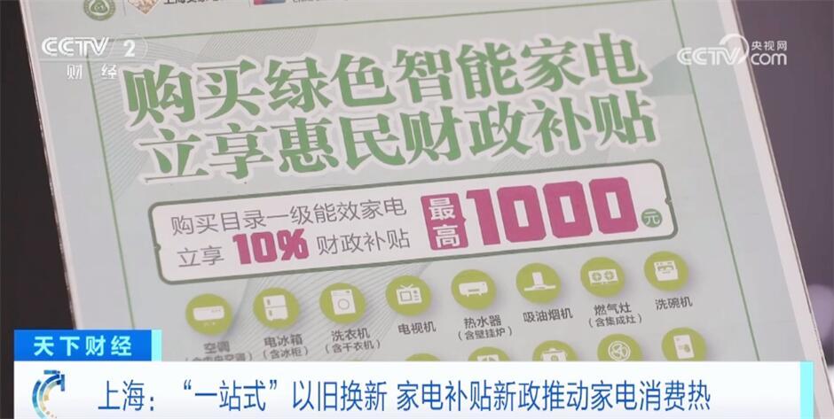 央視網(wǎng)消息:日前,國(guó)務(wù)院印發(fā)《推動(dòng)大規(guī)模設(shè)備更新和消費(fèi)品以舊換新行動(dòng)方案》,明確實(shí)施消費(fèi)品以舊換新行動(dòng)。上海市從3月30日起實(shí)施新一輪綠色智能家電消費(fèi)補(bǔ)貼政策,對(duì)16大類(lèi)一級(jí)能效家電產(chǎn)品進(jìn)行補(bǔ)貼,各大商超賣(mài)場(chǎng)也推出“一站式”以舊換新、延伸局部改造等補(bǔ)貼及服務(wù)。
