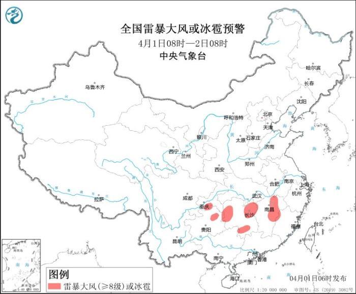 全國雷暴大風或冰雹預(yù)警(4月1日08時-2日08時)