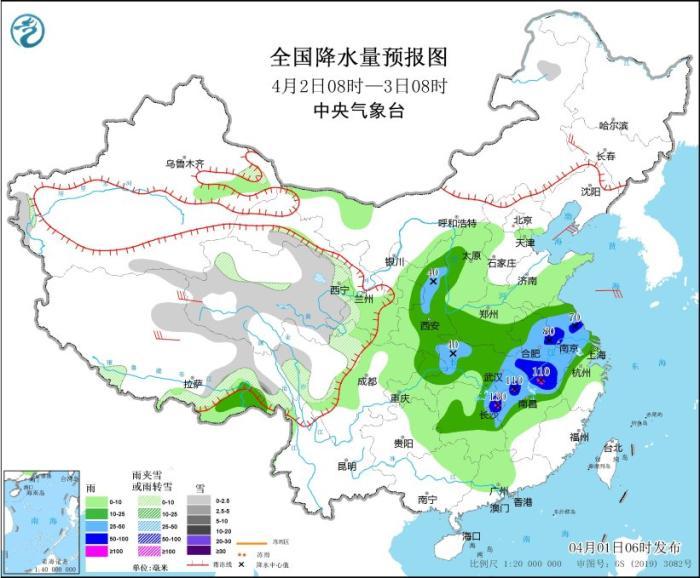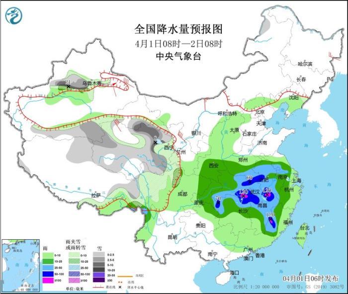 4月1日08時至2日08時,新疆沿天山地區(qū)和南疆盆地、西藏北部和東部、青海大部、川西高原北部等地部分地區(qū)有小到中雪或雨夾雪,其中,新疆沿天山地區(qū)和南疆盆地、青海東北部等地部分地區(qū)有大到暴雪,新疆沿天山地區(qū)局地大暴雪(20~21毫米)。陜西東南部、河南中南部、安徽大部、江蘇中西部、四川東部、重慶大部、貴州東北部、湖北、湖南中北部、江西大部、浙江中西部、福建中西部等地部分地區(qū)有中到大雨,其中,河南南部、安徽中南部、湖北東部和南部、湖南北部和西部、江西北部和東南部、福建西部、重慶東南部等地部分地區(qū)有暴雨,局地大暴雨(100~120毫米)。內(nèi)蒙古西北部、新疆東部、青海西部、甘肅河西等地部分地區(qū)有4~6級風,其中,新疆東部部分地區(qū)有7~8級風,山口風力可達11級以上。