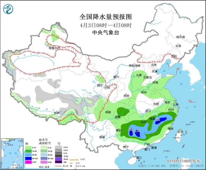 4月3日08時至4日08時,新疆北疆高海拔地區(qū)和南疆西部山區(qū)、西藏北部、東部和西南部、青海南部、川西高原北部等地部分地區(qū)有小到中雪或雨夾雪。四川東部、重慶中部、貴州東部、浙江中南部、江西大部、湖南中南部、廣西北部、廣東北部等地部分地區(qū)有中到大雨,其中,湖南南部、江西中北部、福建西北部、廣西東北部等地部分地區(qū)有暴雨,局地大暴雨(100~110毫米)。