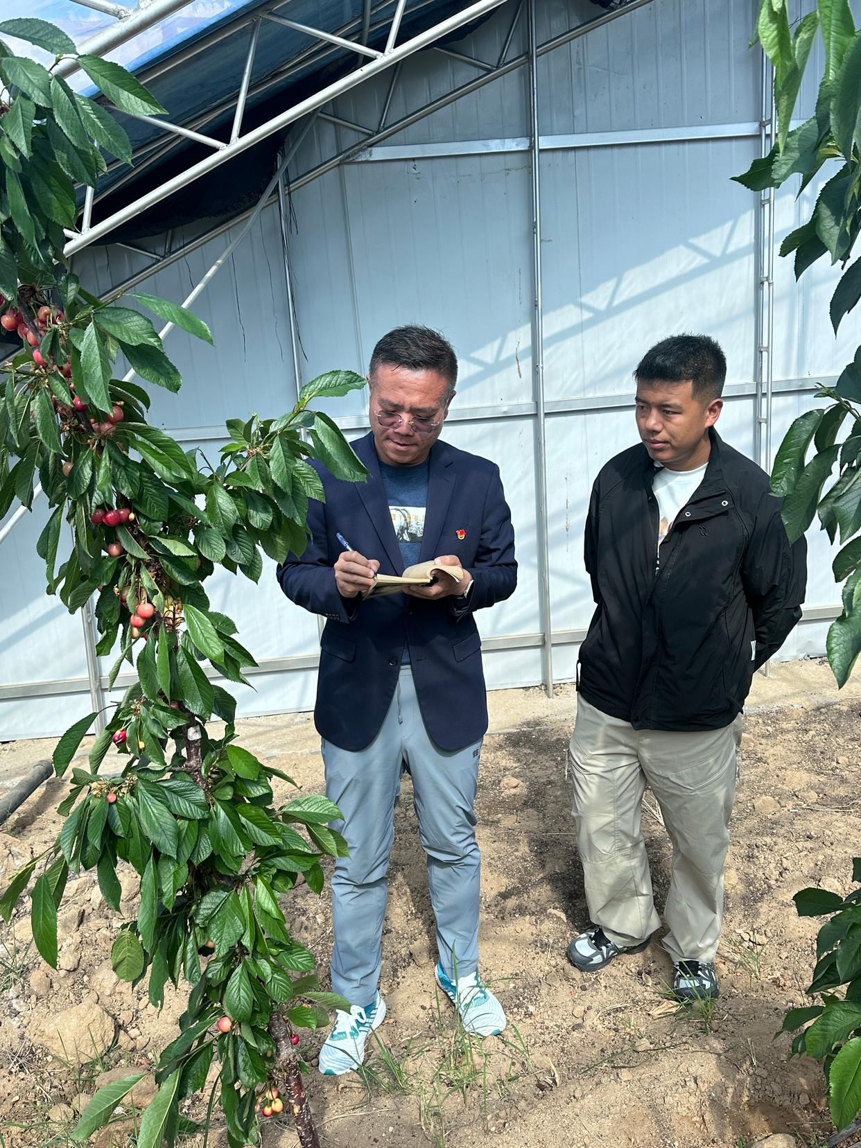 牛堯琪(左)在新建2號櫻桃棚記錄櫻桃結果轉色情況