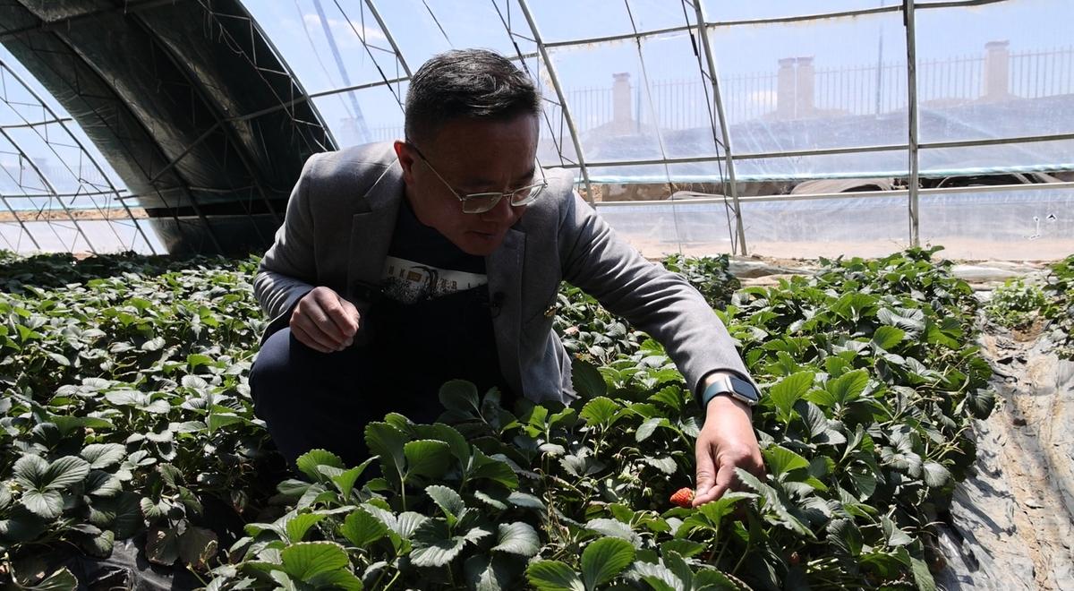 圖為牛堯琪在草莓大棚觀察草莓長勢