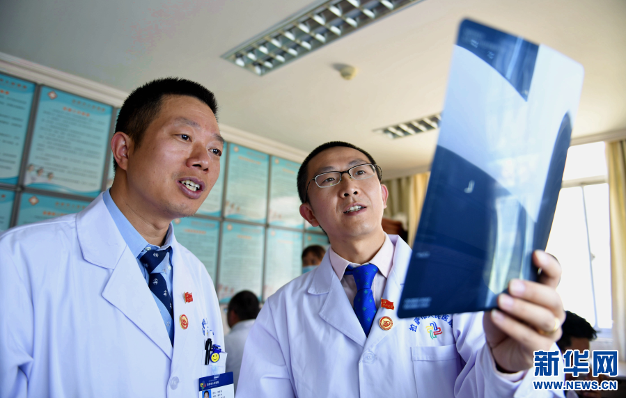 在拉薩市人民醫(yī)院骨科病房內,北京積水潭醫(yī)院的援藏醫(yī)生龔曉峰(右)和北京天壇醫(yī)院援藏醫(yī)生李家謀查看患者的X光片。(2017年8月3日攝)。新華社記者 晉美多吉 攝