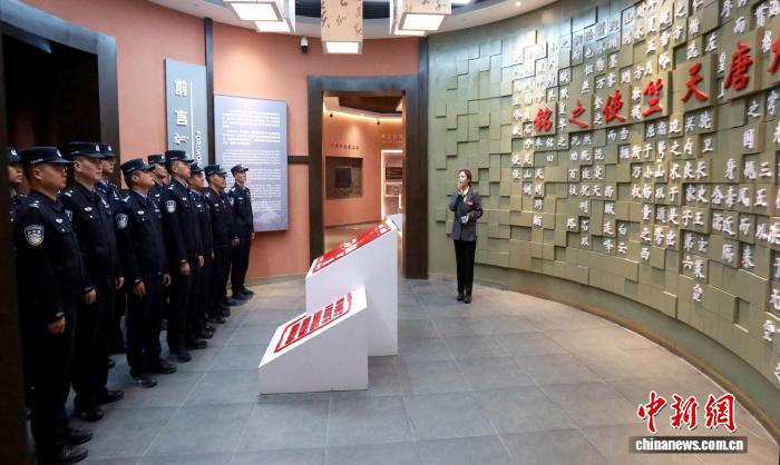 在大唐天竺使之銘陳列館,一塊承載千年歷史的摩崖石刻成為民警們的“第一課”。該陳列館以石刻為核心,通過(guò)珍貴文物、歷史文獻(xiàn)與場(chǎng)景復(fù)原,系統(tǒng)呈現(xiàn)了古代邊關(guān)在中外文明互鑒、邊疆治理中的關(guān)鍵作用。民警們仔細(xì)觀看展品,深刻感悟先輩開(kāi)拓邊關(guān)、守護(hù)疆土的堅(jiān)韌擔(dān)當(dāng)。