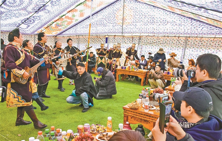 圖為麥巴村群眾以熱情的歌舞和特色美食歡迎遠道而來過工布新年的游客。