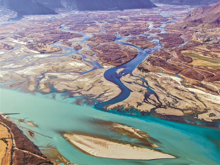 冬日的雅魯藏布江,渚清沙白、色彩斑斕,江水宛如打翻了調(diào)色盤的畫布,是高原生態(tài)之美的靈動(dòng)展現(xiàn)。
