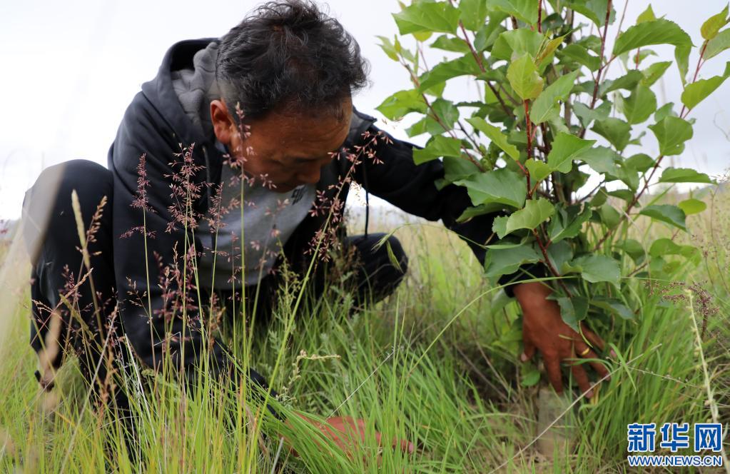 索朗羅布在檢查樹(shù)的長(zhǎng)勢(shì)(2020年8月8日攝)。新華社記者 覺(jué)果 攝