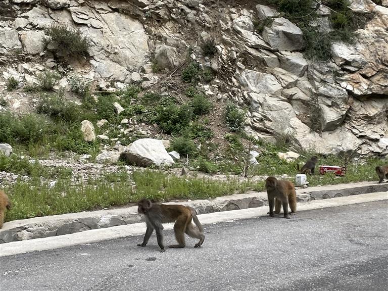 從山南市加查縣沿306省道自駕前往林芝市朗縣的路上,隨時可以遇到下山來覓食的野生藏獼猴。