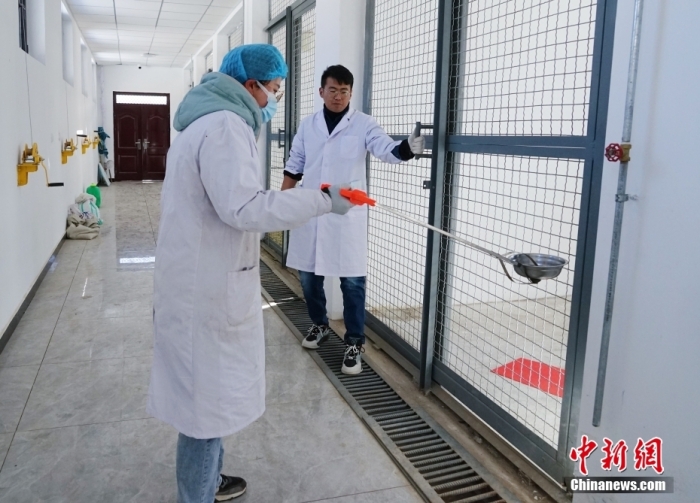 圖為1月18日,在青海省祁連山國家公園野生動物救護繁育站,李全亮和徐豐奕(左)準(zhǔn)備給動物們投食。 中新社記者 馬銘言 攝