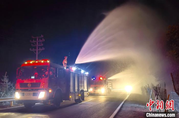 圖為森林消防員正在進(jìn)行灑水增濕作業(yè)?!×种ナ猩窒拦﹫D