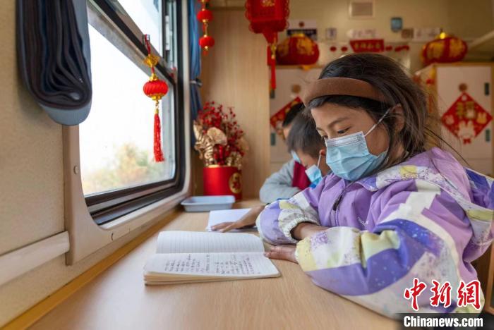 當(dāng)?shù)貙W(xué)生在“慢火車(chē)”上的學(xué)習(xí)車(chē)廂寫(xiě)作業(yè)?!「惰?攝