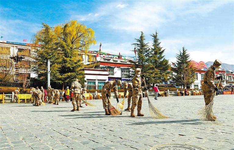 圖為拉薩警備區(qū)某團(tuán)官兵在大昭寺廣場清掃路面。記者 唐斌 通訊員 何琪 攝