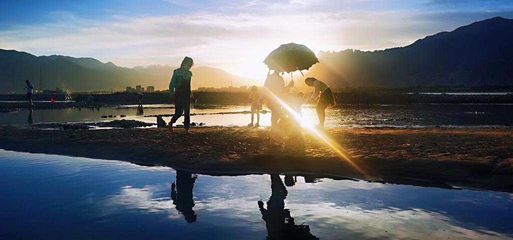 拉薩市民在河邊戲水(2022年7月7日攝)。新華社記者沈虹冰 攝