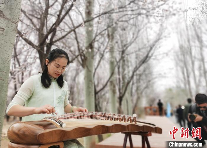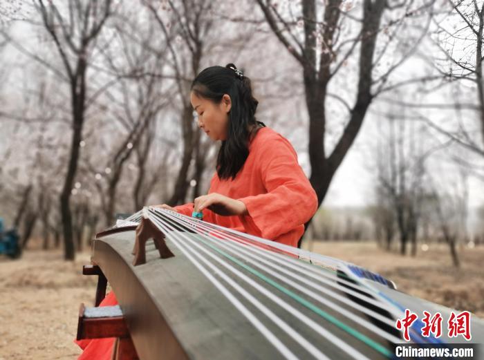 來(lái)自青海西寧的古力在杏花林撫琴,“我特意來(lái)到這邊,在杏花林彈古箏,畫面很美?;ㄩg彈琴本身是一種享受,希望也能感染踏青賞花的游客?!?/p>