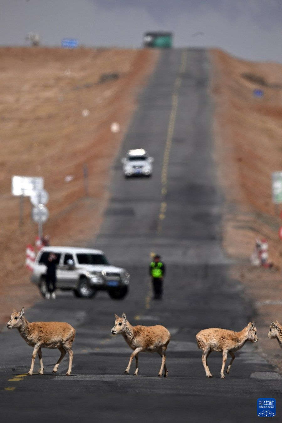 眼下,可可西里藏羚羊進入遷徙產(chǎn)仔高峰期,記者近日在青藏公路3001公里處看到,成群的雌性藏羚羊在公路一側(cè)集結(jié),現(xiàn)場的工作人員對往來車輛進行臨時交通管制。頭羊反復(fù)試探、確認(rèn)沒有危險后,羊群快速通過公路,向可可西里腹地奔去。