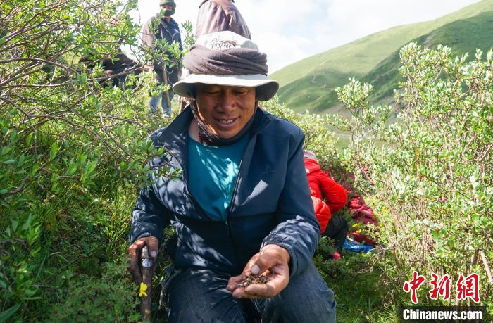 圖為青海省果洛州甘德縣一位藏族牧民展示自己采挖的野生貝母。 馬銘言 攝