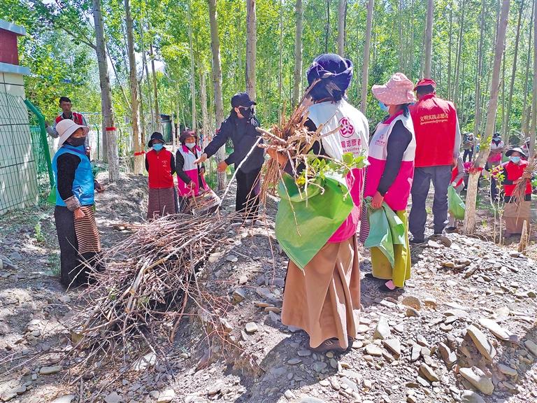 圖為黨員與群眾一起撿拾樹枝。記者 丹增平措 攝