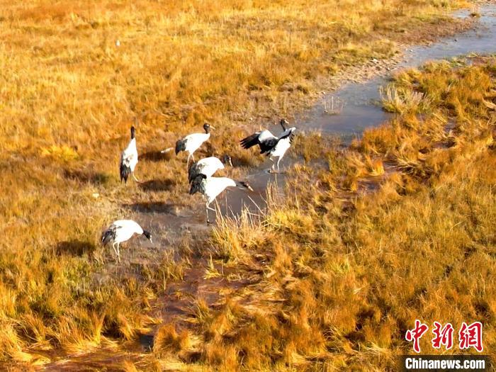 圖為黑頸鶴在金色的草原嬉戲覓食。才新木加 攝