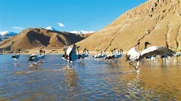 10月23日,成群的黑頸鶴在拉薩市當雄縣阿熱濕地內(nèi)覓食。黑頸鶴是全球十五種鶴類中,唯一在高原地區(qū)繁殖和越冬的鶴類,屬中國國家一級保護野生動物。 [詳細] -