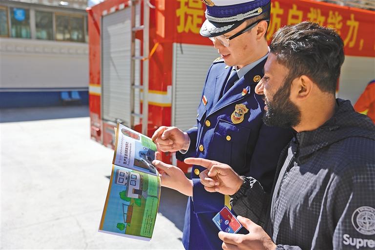 消防宣傳員向入境外籍游客和商人提供暖心服務(wù)。
