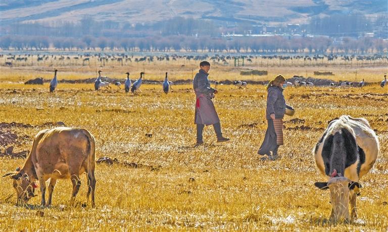 卡孜濕地是其中一個(gè)投食點(diǎn)。現(xiàn)年43歲的洛桑次旦就住在附近,每天一大早,他都會(huì)到卡孜濕地放牧。“‘鄰居’越來(lái)越多了,十幾年的時(shí)間,黑頸鶴的數(shù)量從幾只增長(zhǎng)到幾百只。”洛桑次旦告訴記者,黑頸鶴和牛各吃各的,互不干擾,非常和諧。