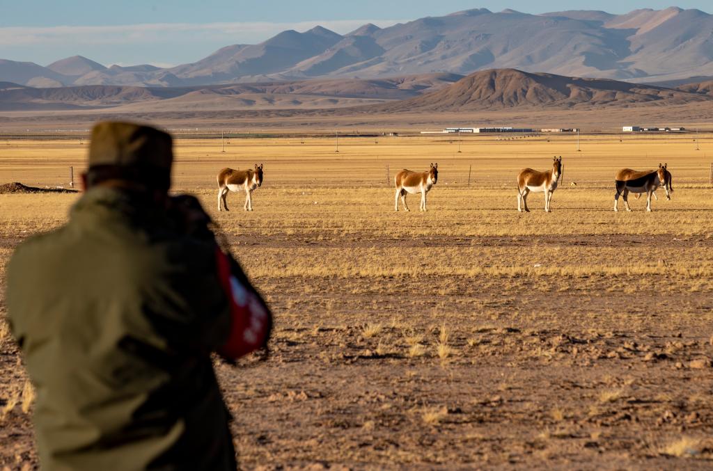格桑倫珠在巡護途中拍攝野生動物(2023年12月21日攝)。新華社記者 姜帆 攝
