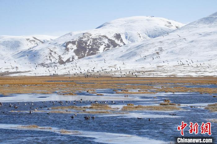 2023年11月15日,成群斑頭雁在青海隆寶灘國際重要濕地內(nèi)展翅飛翔。 記者 馬銘言 攝