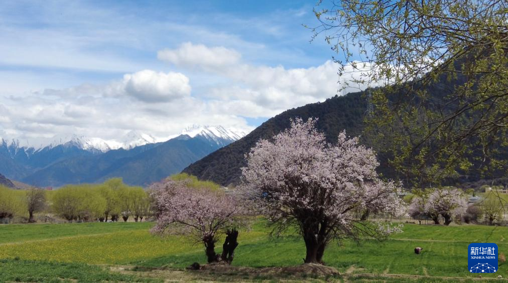 朵當(dāng)村的桃花和雪山相映成趣,田間成片的青稞冒出新綠(3月30日攝)。新華社記者 邱星翔 攝