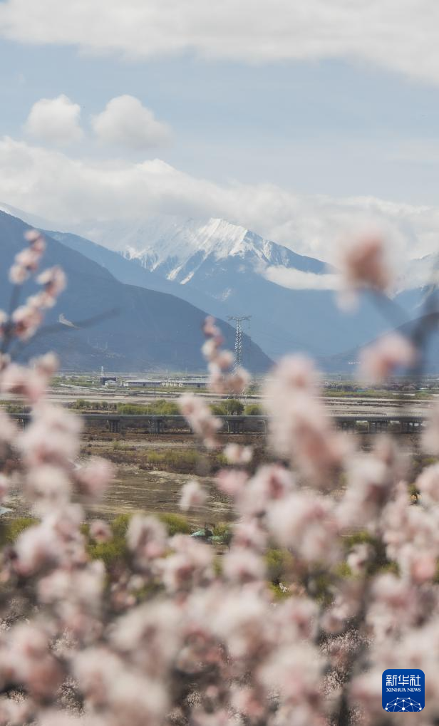 燦若云霞的桃花和潔白無瑕的雪山交織成一幅獨特的雪域高原美景(3月30日攝)。新華社記者 丁增尼達 攝