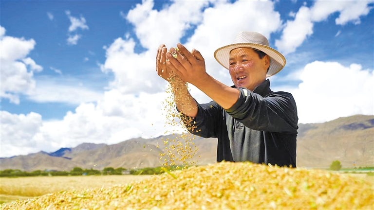 日喀則市白朗縣嘎東鎮(zhèn)馬義村村委會(huì)副主任普瓊手捧豐收的麥粒,高興地說:“高標(biāo)準(zhǔn)農(nóng)田建設(shè)為我們節(jié)省了大量的人力,實(shí)現(xiàn)了農(nóng)業(yè)機(jī)械化,讓未來的生活充滿了希望?!?/p>
