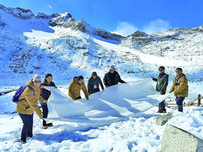 四川阿壩州,中國科學院西北生態(tài)環(huán)境資源研究院科研人員在為冰川“蓋被子”。謝宜達攝/光明圖片