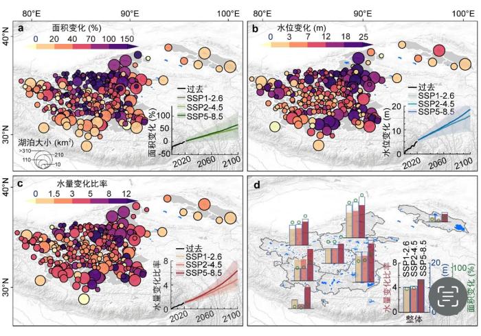 至21世紀(jì)末,中等排放情景下湖泊面積、水位和水量變化。中國科學(xué)院青藏高原研究所/供圖