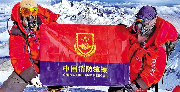 5月21日,西藏圣山高山救援隊隊員攜帶中國消防救援隊隊旗成功登頂珠峰并展示隊旗。(圖片由西藏消防救援總隊提供)