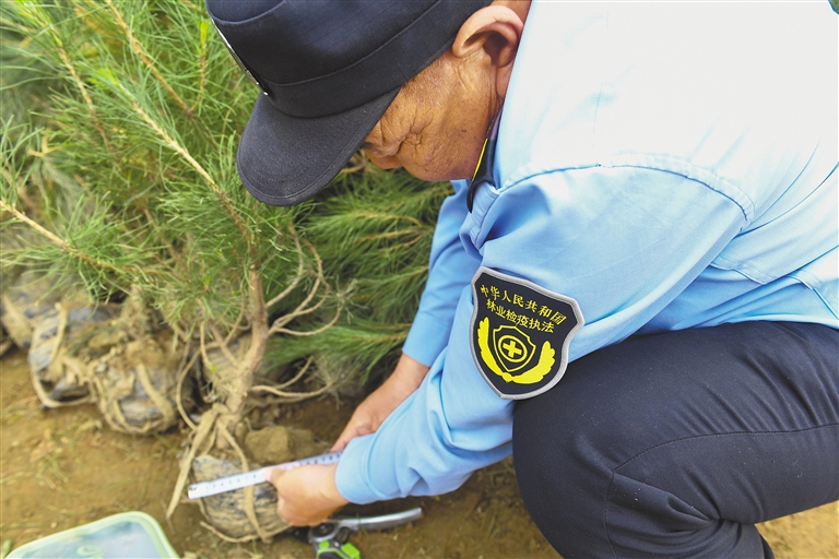 在拉薩南北山綠化工程2024年度鞏固提升(貢嘎機(jī)場周邊山體)工程項目上,林業(yè)檢疫執(zhí)法工作人員在檢查樹苗根部土球是否達(dá)標(biāo)。新華社記者 晉美多吉 攝
