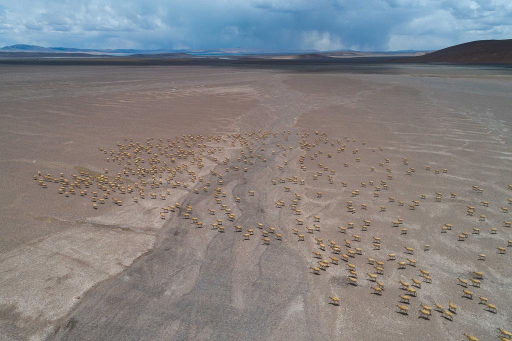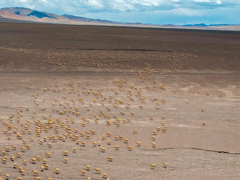 2024年5月10日,在羌塘國家級自然保護區(qū),大群懷孕的雌性藏羚羊開始集結成群,向產(chǎn)羔地遷徙。